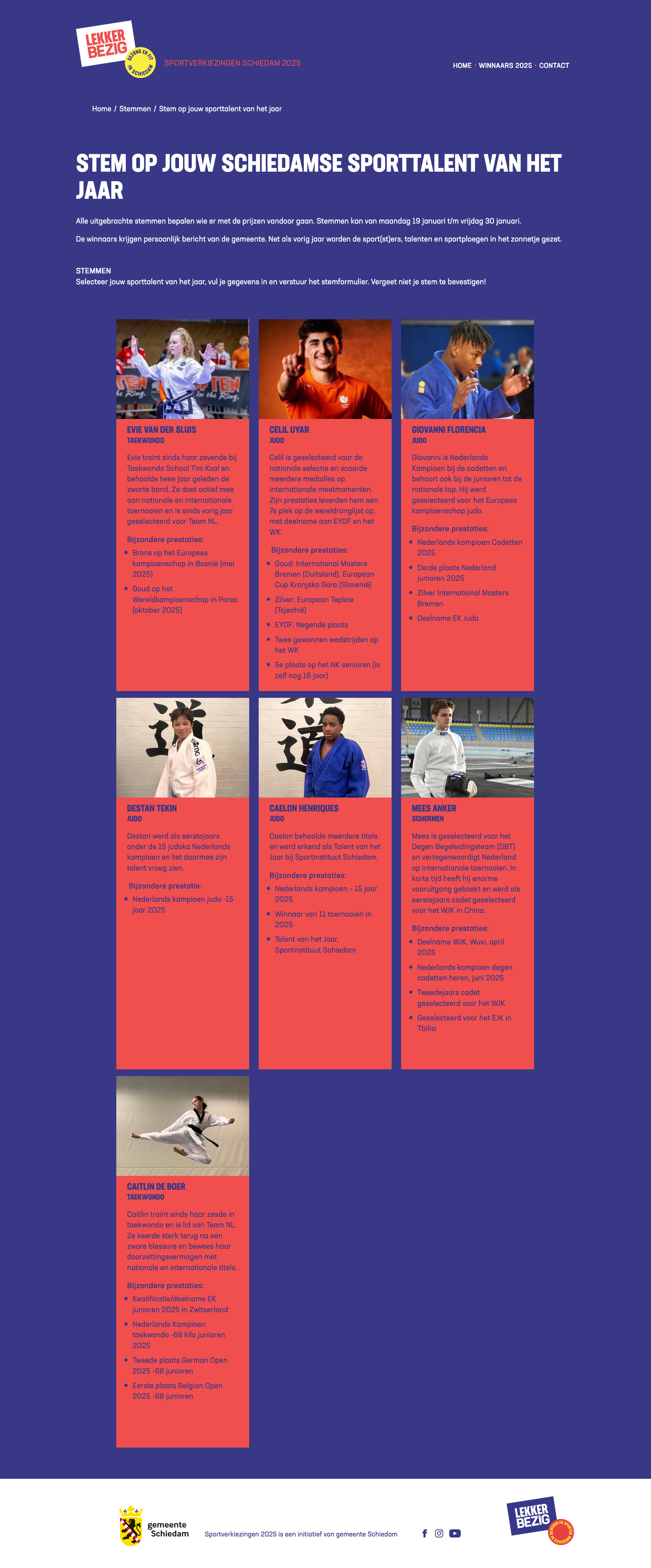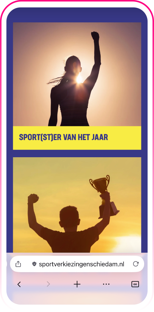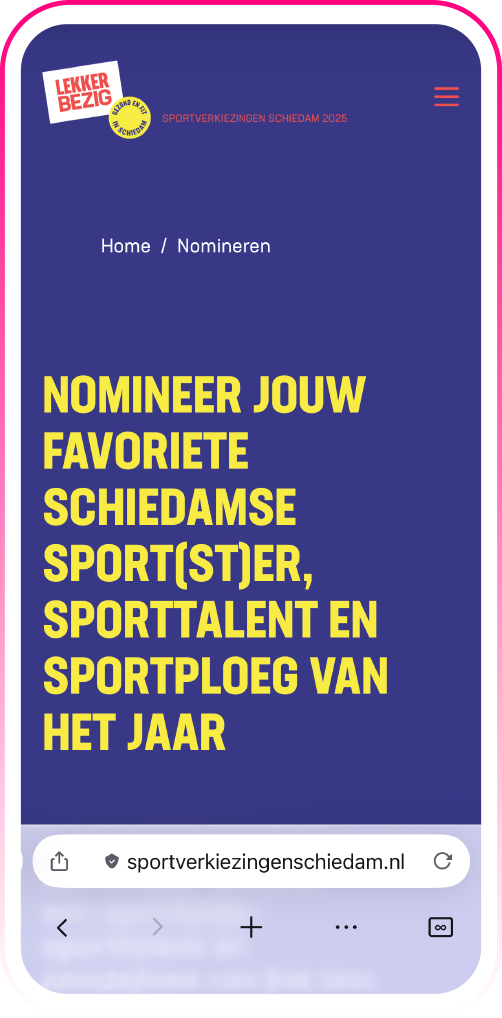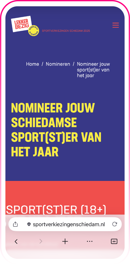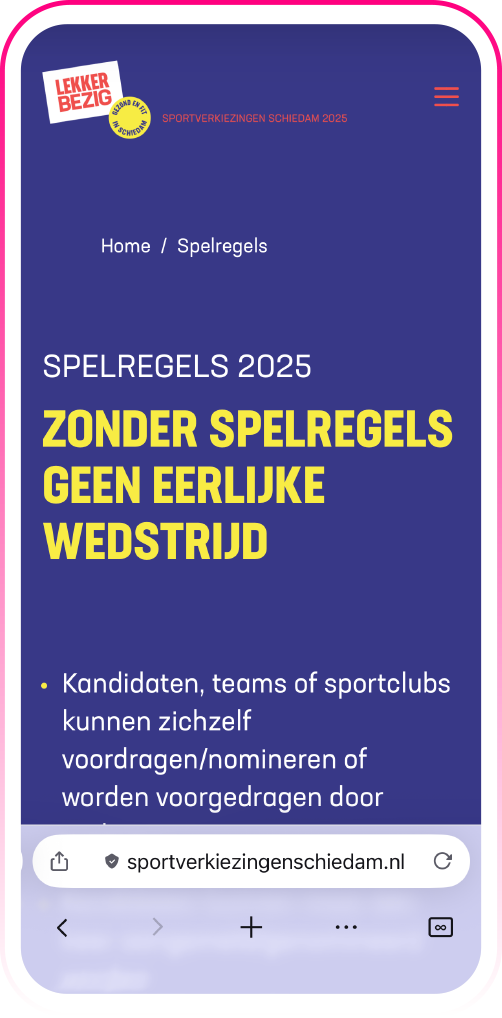 De uitdaging lag erin om een campagne te creëren die inwoners makkelijk activeert om te nomineren en te stemmen én die betrouwbaar is in uitvoering. Daarom hebben we het voor de Sportverkiezingen Schiedam 2025 groots uitgepakt. Naast het ontwikkelen van alle offline en online communicatie-uitingen en een geheel eigen maatwerk online nominatie- en stemsysteem, hebben we ook de productie van de videoreportages van de winnaars verzorgt.